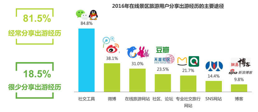 81.5%的在線景區(qū)旅游用戶出游后經(jīng)常分享游覽經(jīng)歷,其中84.8%的用戶通過社交工具分享,移動(dòng)和即時(shí)端口更受用戶青睞;微博和在線旅游網(wǎng)站的出游分享位列第2、3位,占比分別為38.1%和31.0%,在線旅游網(wǎng)站加碼旅游攻略服務(wù)成效顯著。