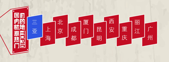 《報告》數據顯示,國慶黃金周期間,國內長線出游方式主要以跟團游為主,占比62%,自助游占比31%,其他還有團隊出游占比6%等。在交通工具選擇方面,與往年相比,今年航空資源航力增加、直飛航線增多,國內長線游選擇飛機出游的游客占到了26%。國內機票熱門目的地TOP10依次為三亞、上海、北京、成都、廈門、昆明、西安、重慶、麗江、廣州。