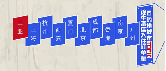國慶期間,隨著大批游客的集中出行,各地酒店同樣迎來入住高峰。《報告》顯示,從酒店消費類型看,高星級度假酒店最為熱門;從酒店入住的目的地看,國慶期間途牛酒店入住訂單量最大的十個目的地城市為三亞、上海、杭州、西安、廈門、北京、成都、香港、南京、廣州,其中,三亞成為“開房之都”。從客源地看,預訂酒店產品游客人次最多的TOP10城市分別為上海、北京、南京、天津、廣州、杭州、武漢、成都、西安、深圳,上海用戶出游“開房”最多。