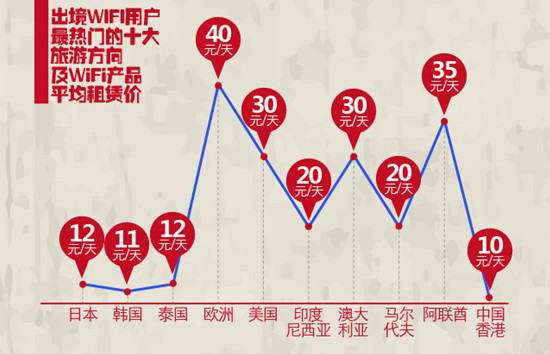另外,《報告》數據顯示,使用出境WiFi用戶最熱門的十大旅游方向及WiFi產品平均租賃價分別為:日本(12元/天)、韓國(11元/天)、泰國(12元/天)、歐洲(40元/天)、美國(30元/天)、印度尼西亞(20元/天)、澳大利亞(30元/天)、馬爾代夫(20元/天)、阿聯酋(35元/天)、中國香港(10元/天)。