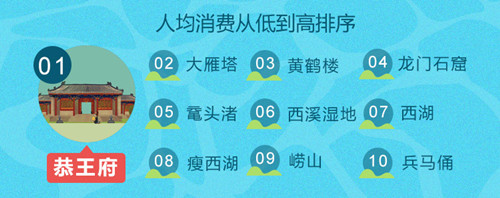 如果細化到具體景區,恭王府、大雁塔、黃鶴樓、龍門石窟、黿頭渚、西溪濕地、西湖、瘦西湖、嶗山、兵馬俑是“十大良心景區”——它們都是5A級景區,但人均消費最少。