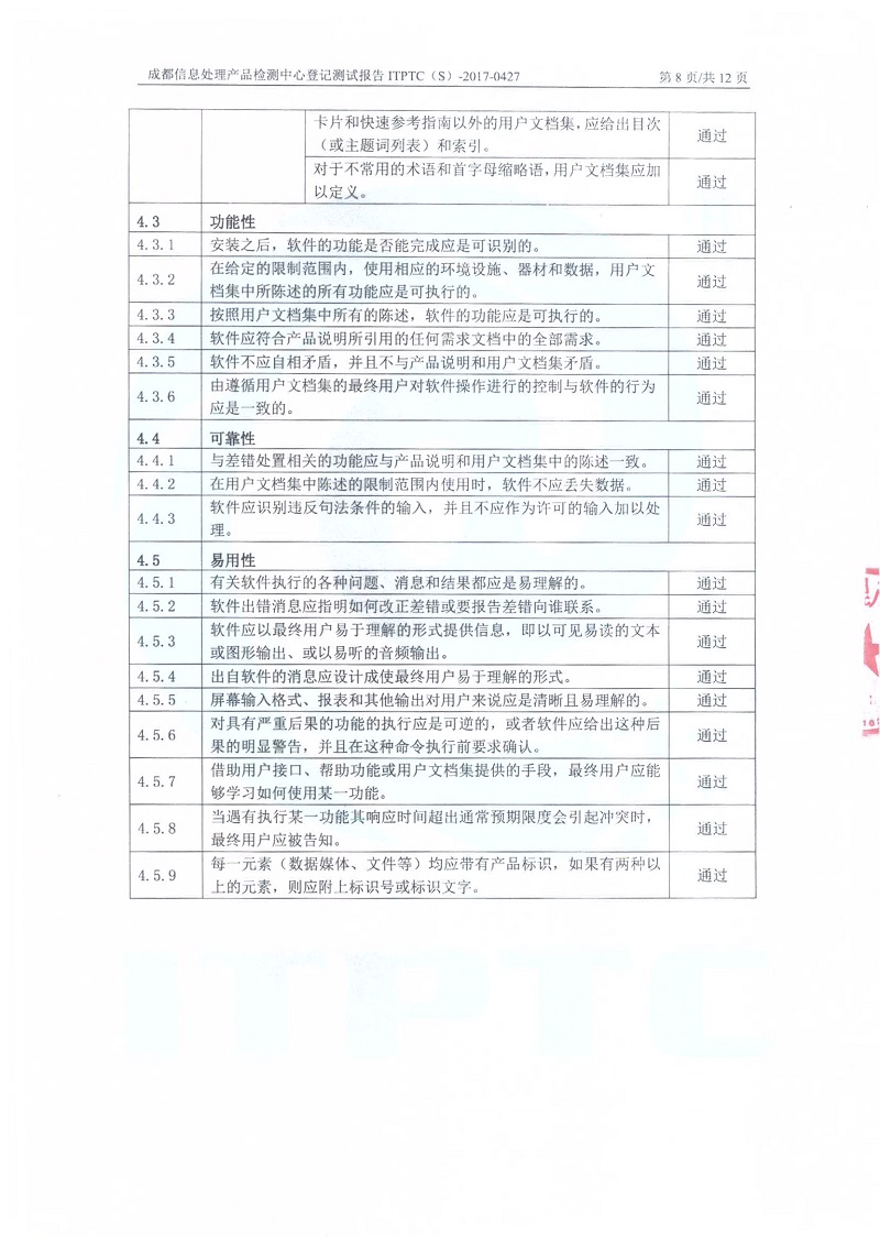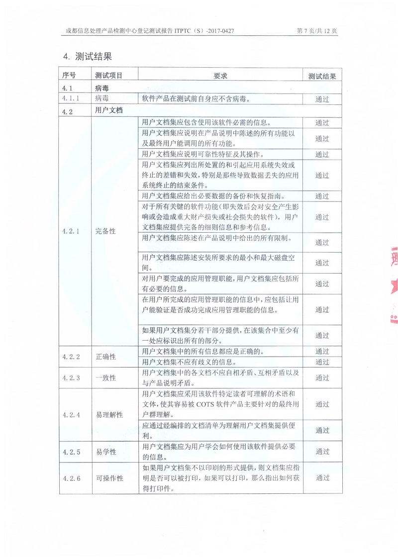測試結果顯示,所有軟件產品綠色安全,不含惡意代碼和病毒;用戶文檔完善,包含產品使用各個方面的所有必要信息,采用軟件特定使用群體可理解的術語和文體,簡潔易懂;軟件所有應用功能均可執行,運行過程中具有極高可靠性;軟件操作使用簡單,用戶使用難度低。