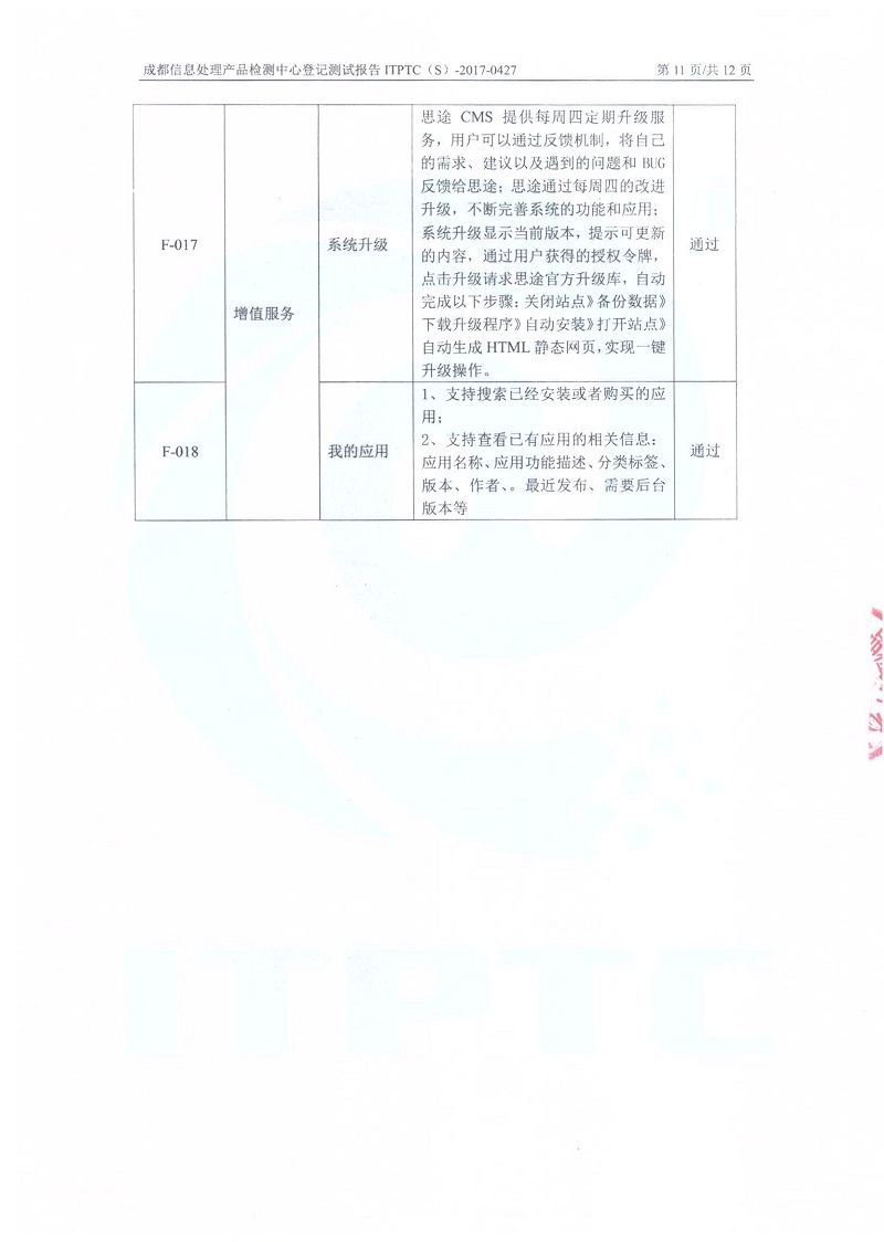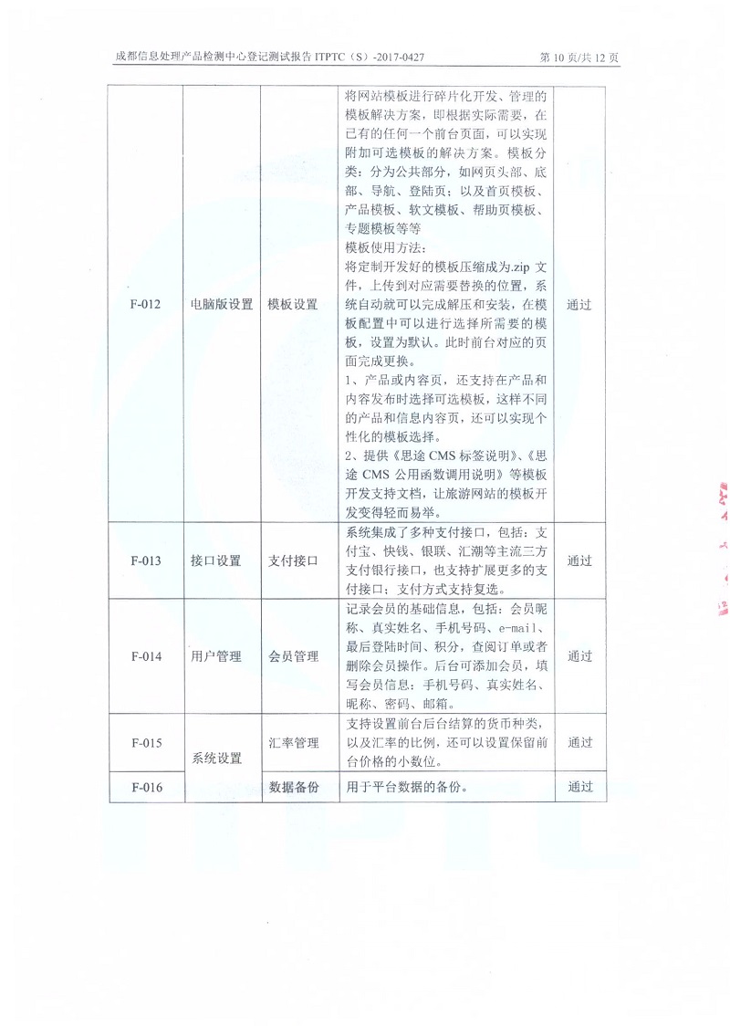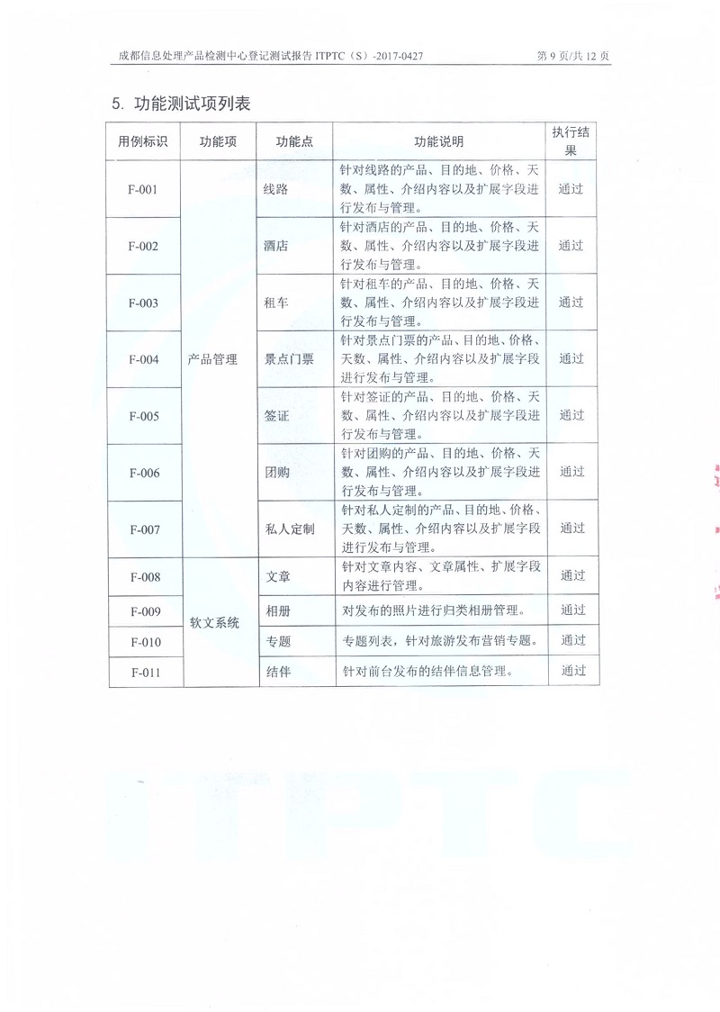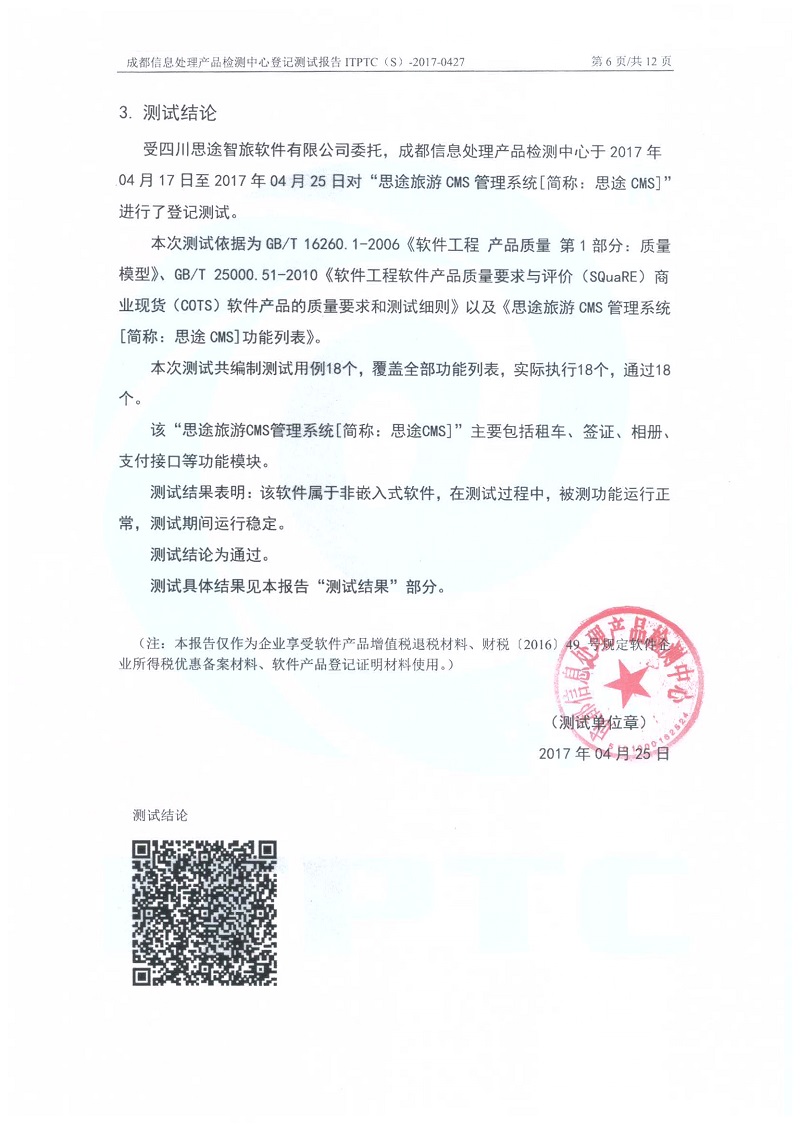 2017年4月17日至4月25日,成都信息處理產品檢測中心(簡稱:ITPTC)對思途旅游CMS管理系統?進行了登記測試,本次測試共編制測試用例18個,覆蓋全部功能列表。實際執行18個,通過18個,產品品質完全符合ITPTC的各項標準。思途于4月25日被授予ITPTC證書,成為通過ITPTC認證的軟件產品企業。