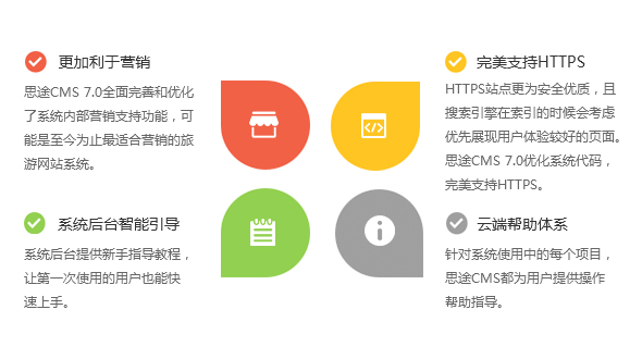 思途CMS 7.0全面完善和優(yōu)化了系統(tǒng)內(nèi)部營銷支持功能,如批量Title功能完善,偽靜態(tài)配置,Sitemap,死鏈排查功能優(yōu)化。并且在7.0版本后續(xù)升級過程中,我們將把系統(tǒng)營銷功能作為重點(diǎn)進(jìn)行優(yōu)化,讓思途CMS成為最懂營銷,最適合營銷的旅游網(wǎng)站系統(tǒng)。