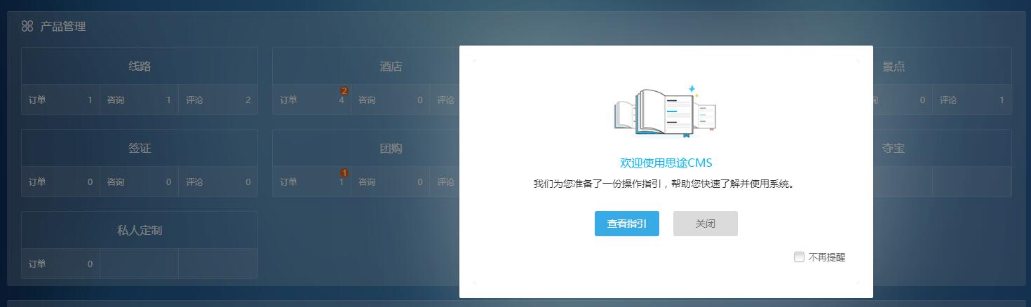思途CMS為新用戶準(zhǔn)備了一份操作指引,幫助用戶快速了解和使用系統(tǒng)。新用戶在首次使用系統(tǒng)時(shí),將會出現(xiàn)指引界面,引導(dǎo)用戶完成網(wǎng)站和產(chǎn)品配置。
