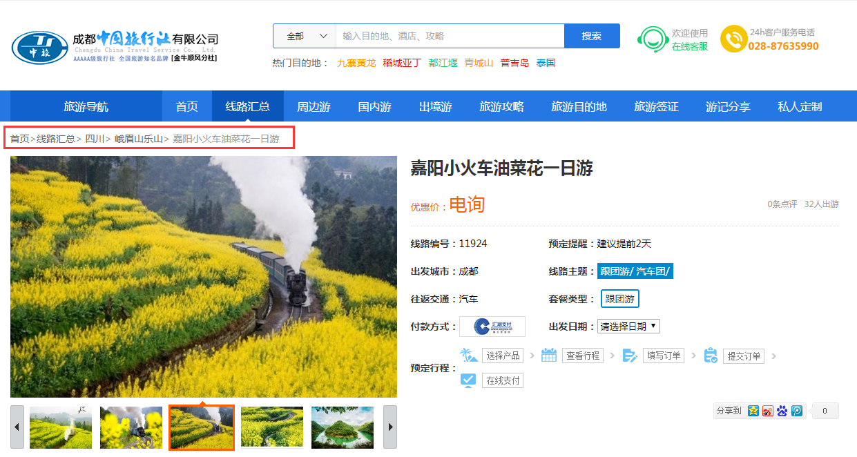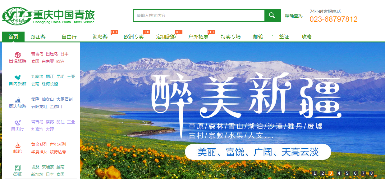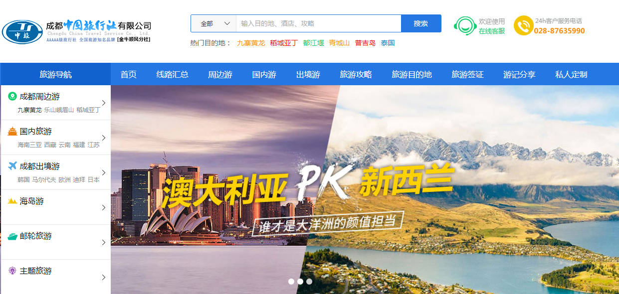 網站都會有附加欄目,雖然它們不屬于網站的主要內容,但它們也是網站不能缺少的內容。比如常見的“24小時客服電話”、“登錄/注冊按鈕”、“聯系我們”等。這些應該放在網站哪個位置好呢?頂部導航欄空間有限,主要用來呈現旅游網站主要業務,像線路、酒店、簽證等等,如果都放在頂部導航欄,則顯得主次不分。一般來說,附加欄目放在網站頂部右側位置,如下圖所示是使用思途CMS的重慶中青旅,它的頂部右側放了24小時客服電話。