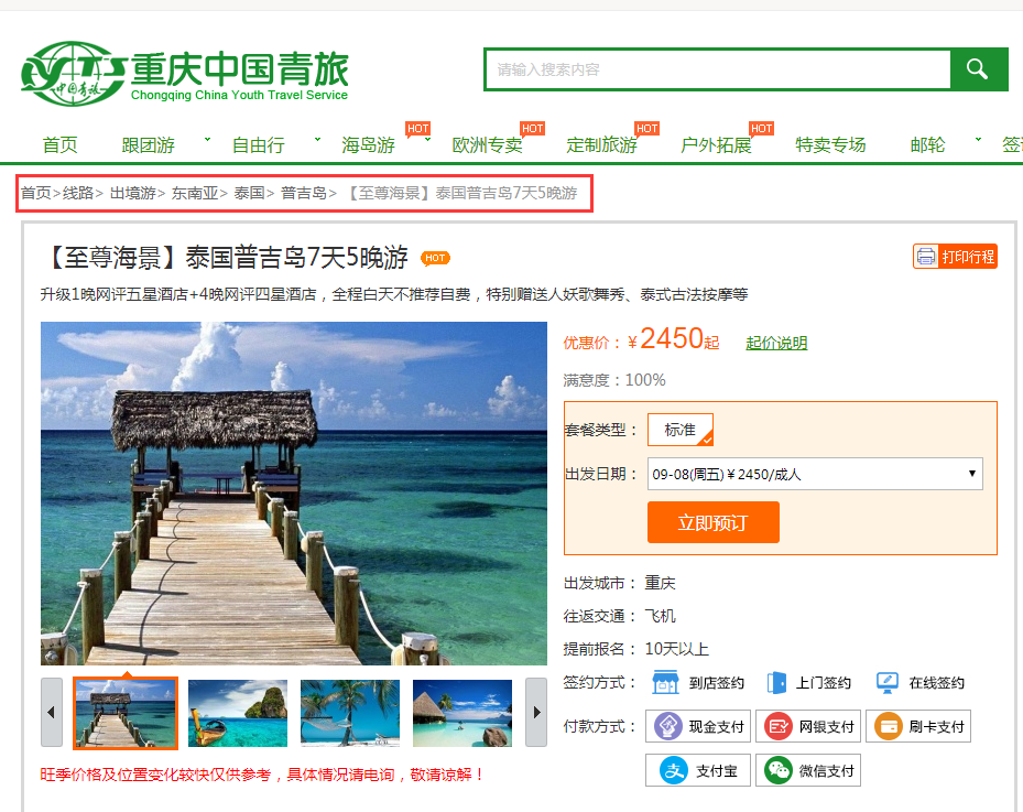 其實很多的旅游網站都不只一種導航設計模式,例如使用思途CMS的順風旅游網,用頂部水平導航欄作為主導航,并使用側邊導航欄作為輔助,同時還有面包屑導航,增加頁面的便利度。