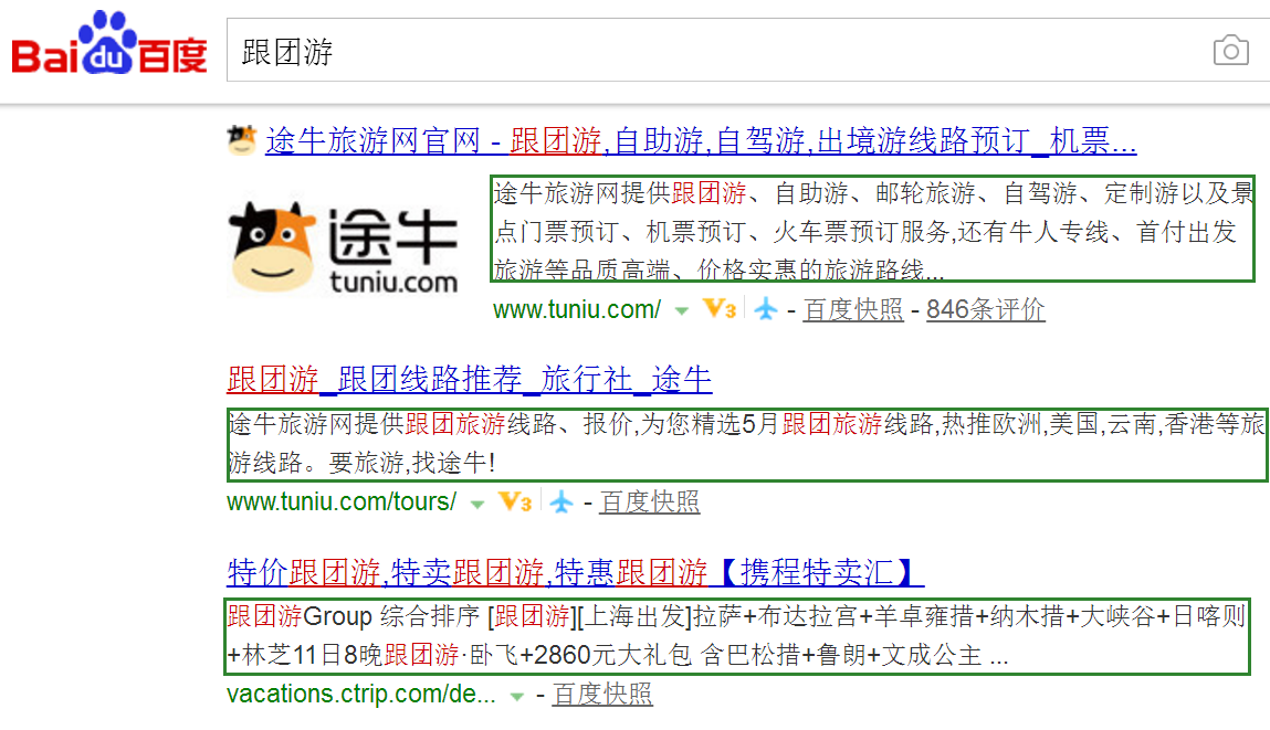 (4)可吸引用戶點擊:如上圖所示,當用戶搜索的關鍵詞出現在描述中時,會被加紅顯示,如果描述精彩,契合用戶的需要,則更能吸引用戶點擊。