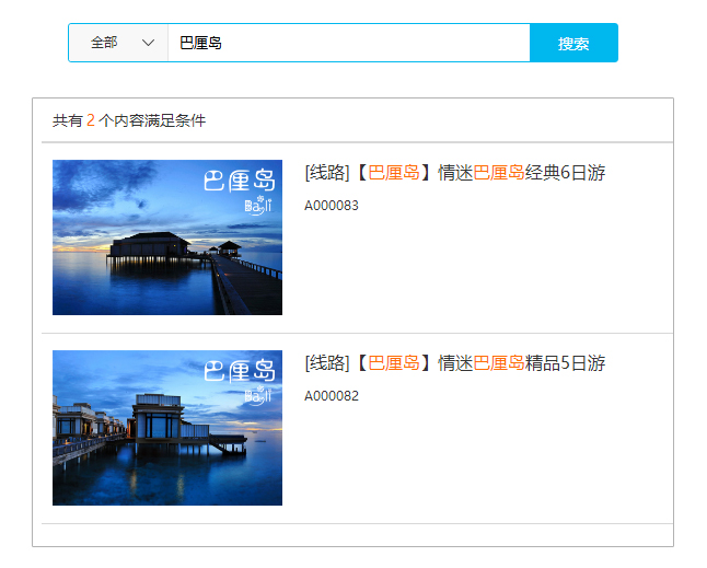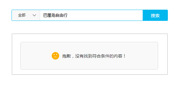 以前的搜索結果是這樣的:當游客想去巴厘島度假,在搜索框內輸入“巴厘島自由行”,因為搜索結果采用搜索詞精確匹配的方式,當所有產品的標題里面都沒有出現“巴厘島自由行”時,就不會搜出任何內容。