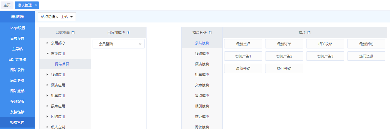 登錄后臺系統 > 站點管理 > 電腦端,找到模塊管理。
