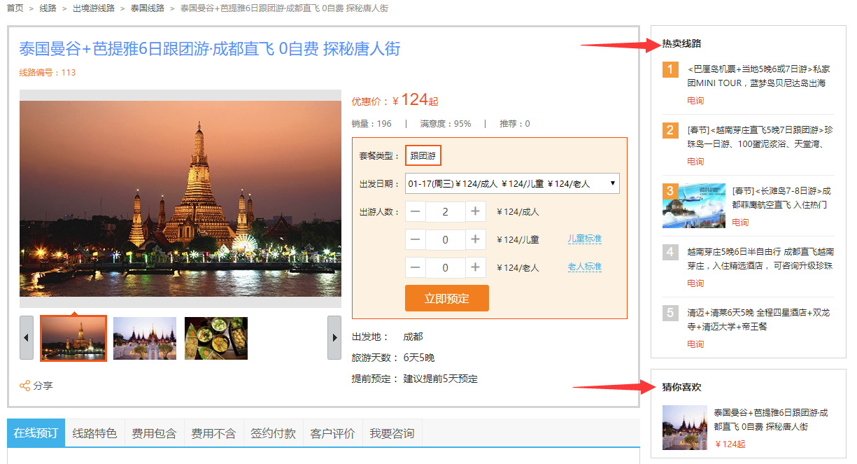 這是一個對旅行社來說更加實用的場景。舉個栗子,你可以在線路欄目內添加一個目的地相關的酒店、景點、文章模塊。這樣,用戶在瀏覽三亞線路產品時,右側就會向用戶推薦三亞附近的酒店、好玩的地方或者三亞的旅游攻略;用戶瀏覽成都的線路,系統就會向用戶推薦成都的酒店、景點。用戶很有可能在預訂了線路產品的時候又順便定了個推薦的酒店。