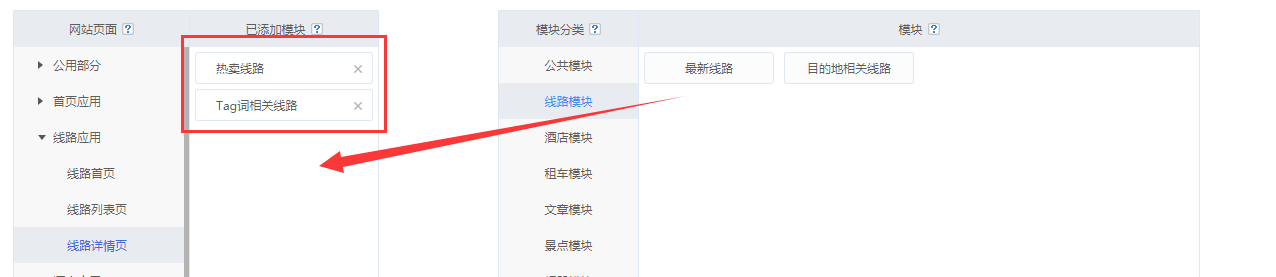 在右側選擇需要添加到線路詳情頁的模塊,如熱賣線路,Tag詞相關線路。