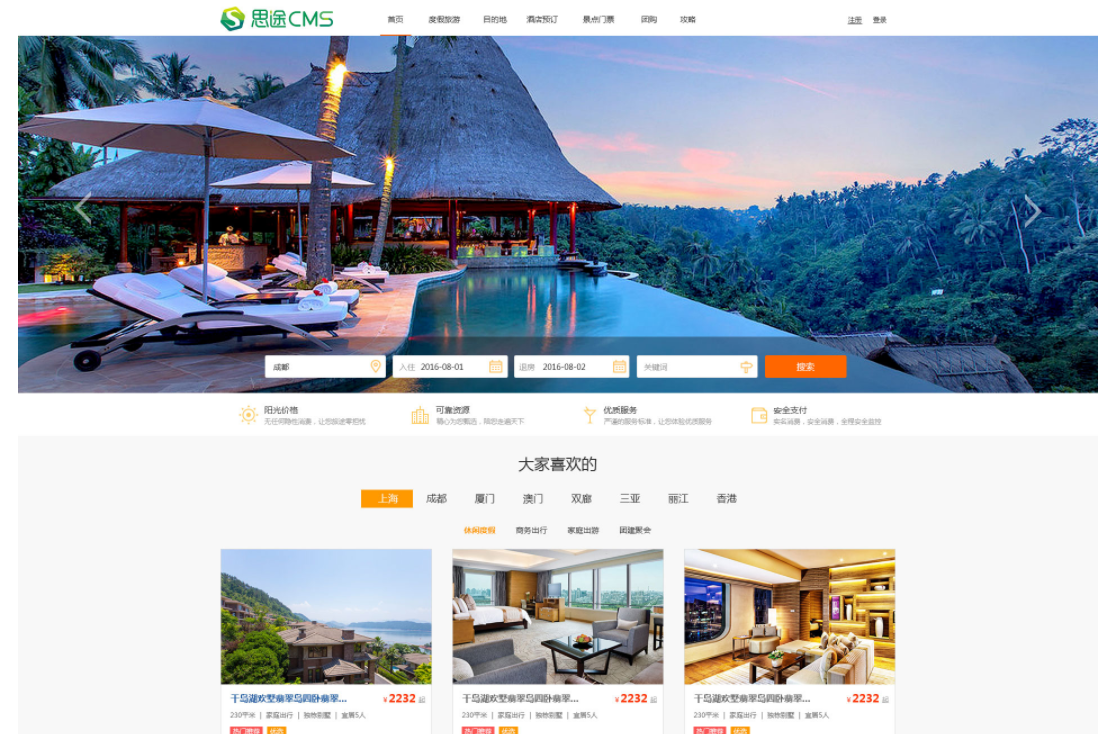 還有一些朋友的網(wǎng)站可能是專注于某一類型的產(chǎn)品,比如是專做酒店產(chǎn)品的電商平臺,那這個時候,我們可能就會考慮網(wǎng)站的專業(yè)性。在沒有額外預(yù)算做定制開發(fā)的情況下,我們就可以考慮精準的類型模板。以酒店網(wǎng)站為例,我們的站長朋友就可以選擇思途仿途家酒店首頁模板。這套模板就是專為酒店平臺量身打造,一切導(dǎo)向都以酒店業(yè)務(wù)為基準。游客進入我們的網(wǎng)站后,就可以快速地篩選查找和預(yù)訂酒店產(chǎn)品了。 此外,本套模板也配備了攻略和游記等引導(dǎo)模塊,也利于站長在網(wǎng)站進行軟文推廣哦。