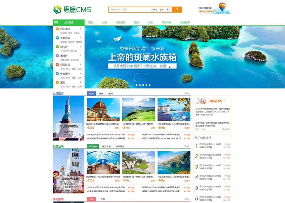 很多站長都會將途牛等OTA網(wǎng)站作為學(xué)習(xí)和參考的對象,因為這些大佬們的門戶首頁兼具精美和實用的特性。而思途仿途牛門戶首頁模板就是專為中大型旅游網(wǎng)站或綜合里門戶旅游網(wǎng)站打造。這套模板的功能齊全,基本涵蓋了線路、酒店、門票等所有常見業(yè)務(wù)。欄目分類也較為清晰,游客可以非常直觀地查找到自己所需要的旅游產(chǎn)品。同時,這套明星模板還設(shè)計了高清大圖Banner以及點評攻略等引導(dǎo)模塊來吸引游客,引導(dǎo)性也很強哦!