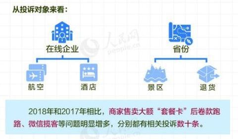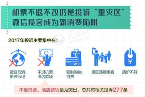 從具體的投訴內容來看,機票、酒店、旅行社、景區(qū)、導游仍是投訴的重災區(qū)。其中,機票不退不改,依然是大家吐槽的重點。除此之外,微信、公眾號參團糾紛以及商家售賣大額“套餐卡”后卷款跑路等問題反映也明顯增多,但是由于缺乏正規(guī)的書面合同,消費者維權也存在一定的難度。