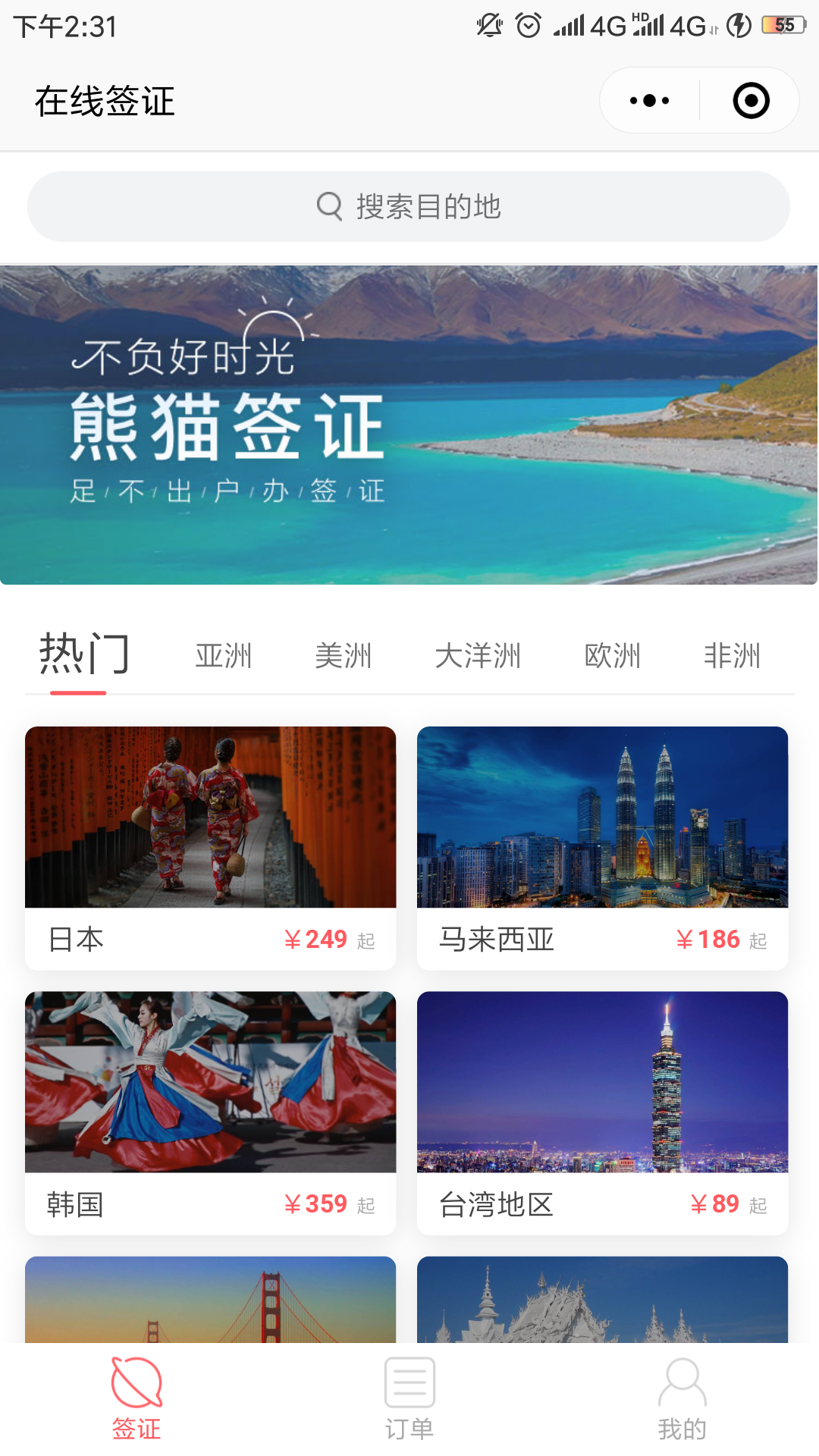熊貓簽證:游客可以直接通過這個小程序足不出戶,就能辦理簽證,使簽證資料電子化。在首頁游客可通過搜索欄查找目的地,也可以在導(dǎo)航欄中的熱門,五大洲分類查找,同時在頁面的下方看到商家為簽證所提供的增值服務(wù)。