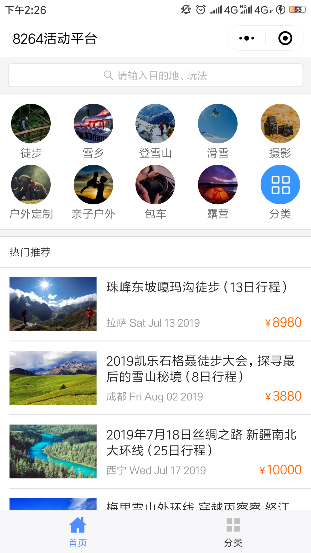 戶外活動助手:戶外活動助手是8264活動平臺的微信小程序版本,它可以說是戶外活動愛好者的天堂。該小程序不但囊括了無數(shù)種的戶外項目,而且還為這些項目定制了許多熱門線路。