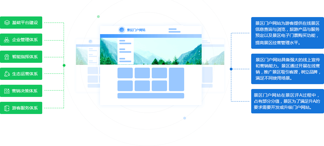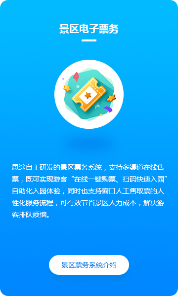 思途景區門戶解決方案將為旅游景區建設一套線上線下相結合的綜合信息化服務系統, 通過景區信息平臺、電子商務平臺、電子票務系統,為游客提供線上景區信息查詢、在線預訂、線下游客入園等一系列自助體驗