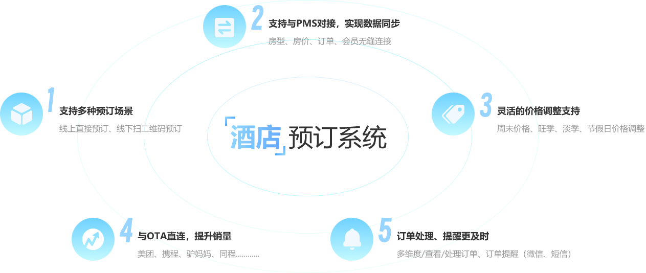 針對酒店提供一整套完善的線上電商解決方案,主要解決酒店在線預訂需求,10端合一,可支持多渠道售賣,