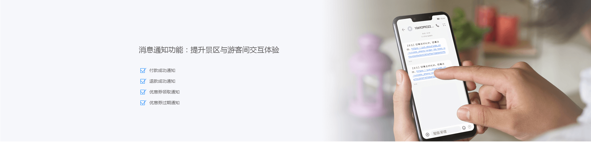 實現(xiàn)景區(qū)內(nèi)和景區(qū)周邊各類型酒店住宿商品展示,游客可通過景區(qū)門戶網(wǎng)站進行查詢和預訂。購買支付成功后,系統(tǒng)將訂單信息發(fā)送至客戶手機。