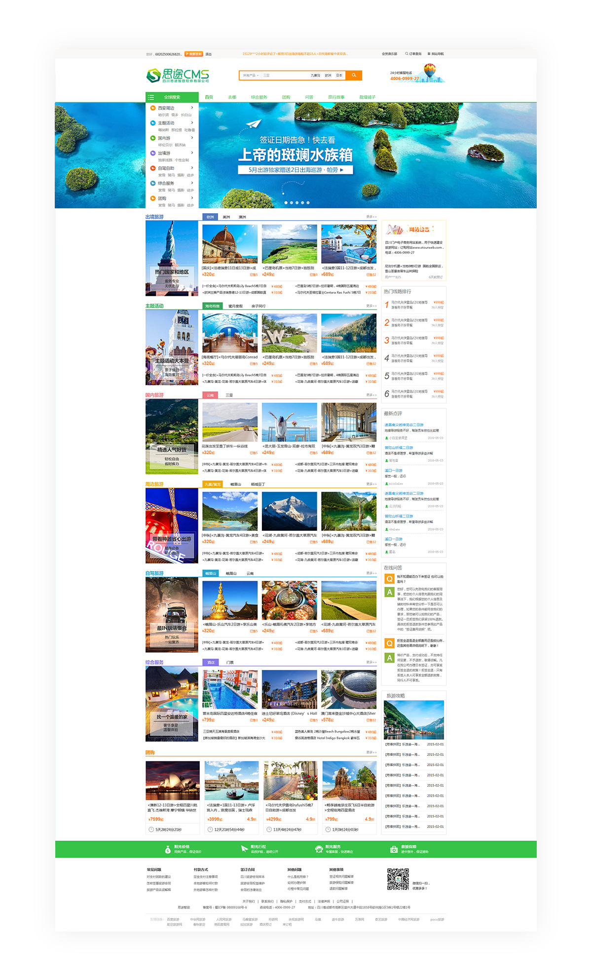 (網站首頁)此模板為參考途牛旅游網站,精心設計的仿途牛綜合門戶旅游網站首頁模板。網站首頁功能齊全:線路、酒店、門票、租車、團購應有盡有;分類清晰:出境游、國內游、周邊游、自駕游,主題游一應俱全;產品突出:通過頂部Banner,豐富的旅游場景圖片和攻略點評吸引游客目光。此套仿途牛門戶首頁模板是旅游企業建設中大型旅游網站或綜合門戶旅游網站的明星模板。* 該模板不支持二級導航,右側僅支持效果圖上模塊。該模板不支持換膚。