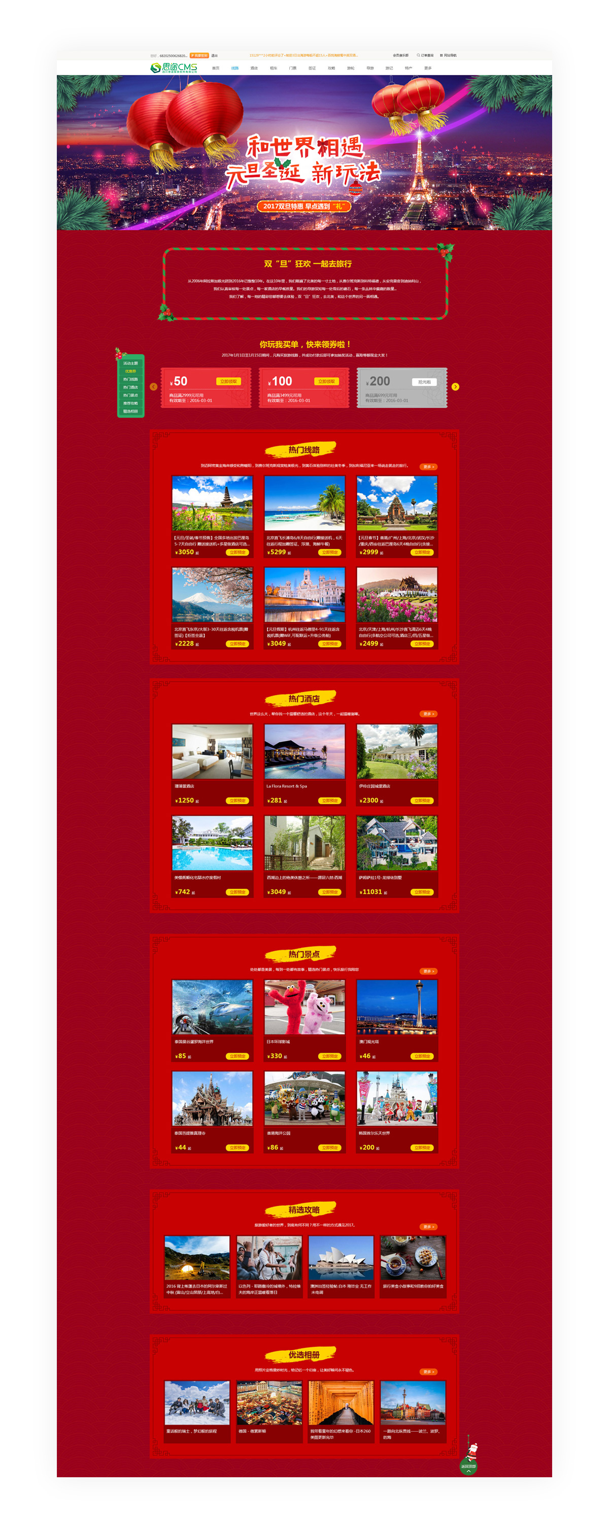 (專(zhuān)題頁(yè))此模板為節(jié)日專(zhuān)題模板。模板以節(jié)日為主題,用紅色背景突出節(jié)日喜慶氛圍,給人強(qiáng)烈的視覺(jué)沖擊力。專(zhuān)題模板在展示網(wǎng)站旅游產(chǎn)品的同時(shí),還具有較強(qiáng)的營(yíng)銷(xiāo)屬性。以節(jié)日為活動(dòng)進(jìn)行促銷(xiāo),可以獲得大量的流量和關(guān)注度,加強(qiáng)流量引導(dǎo)將有助于轉(zhuǎn)化率的提升。使用此模板可以幫助網(wǎng)站更好地進(jìn)行年末圣誕元旦春節(jié)節(jié)日促銷(xiāo),因其具有較強(qiáng)的實(shí)效性,所以建議在節(jié)日前提前購(gòu)買(mǎi),為專(zhuān)題活動(dòng)上線做準(zhǔn)備。*使用此模板需提前安裝全新專(zhuān)題應(yīng)用(No.67)該模板不支持換膚。